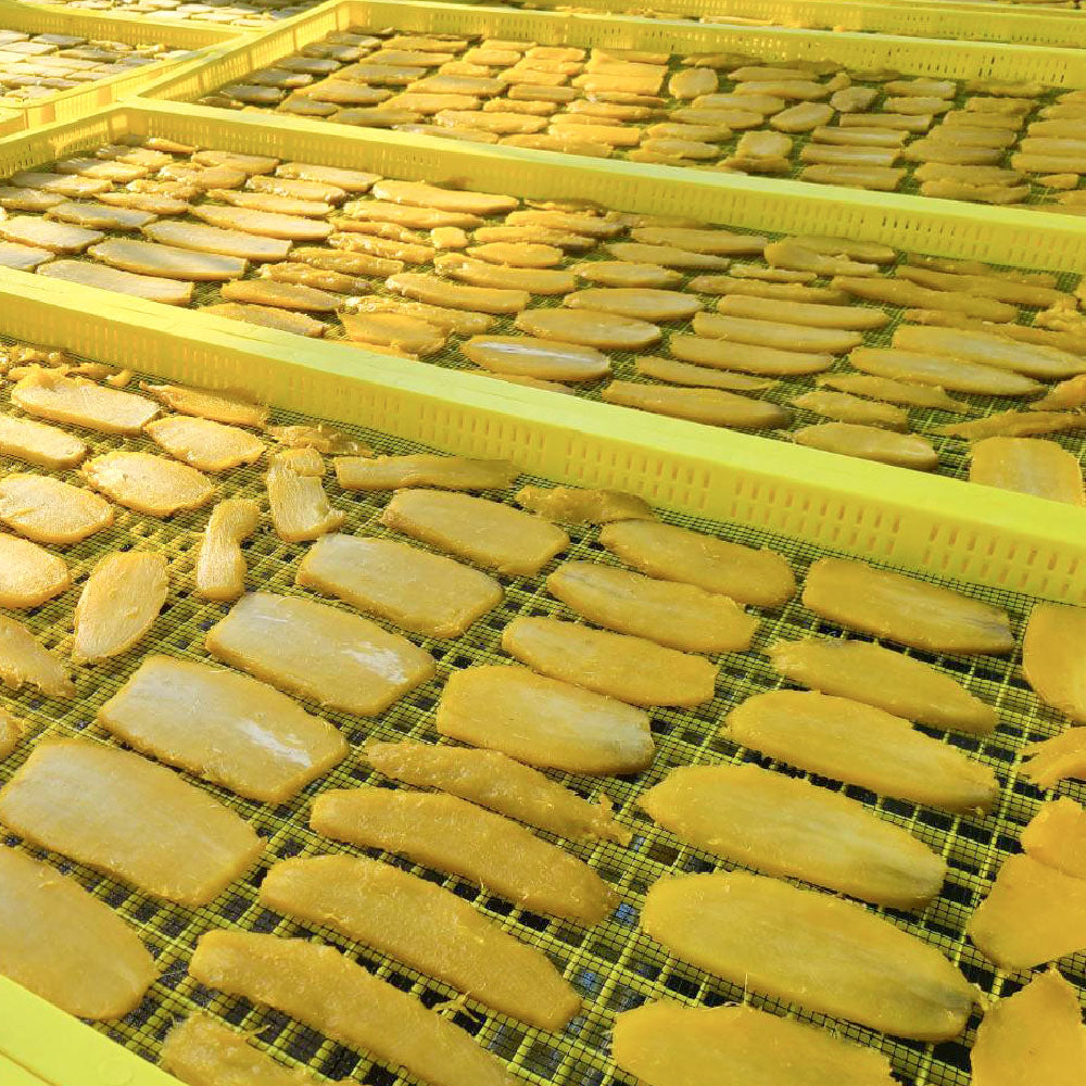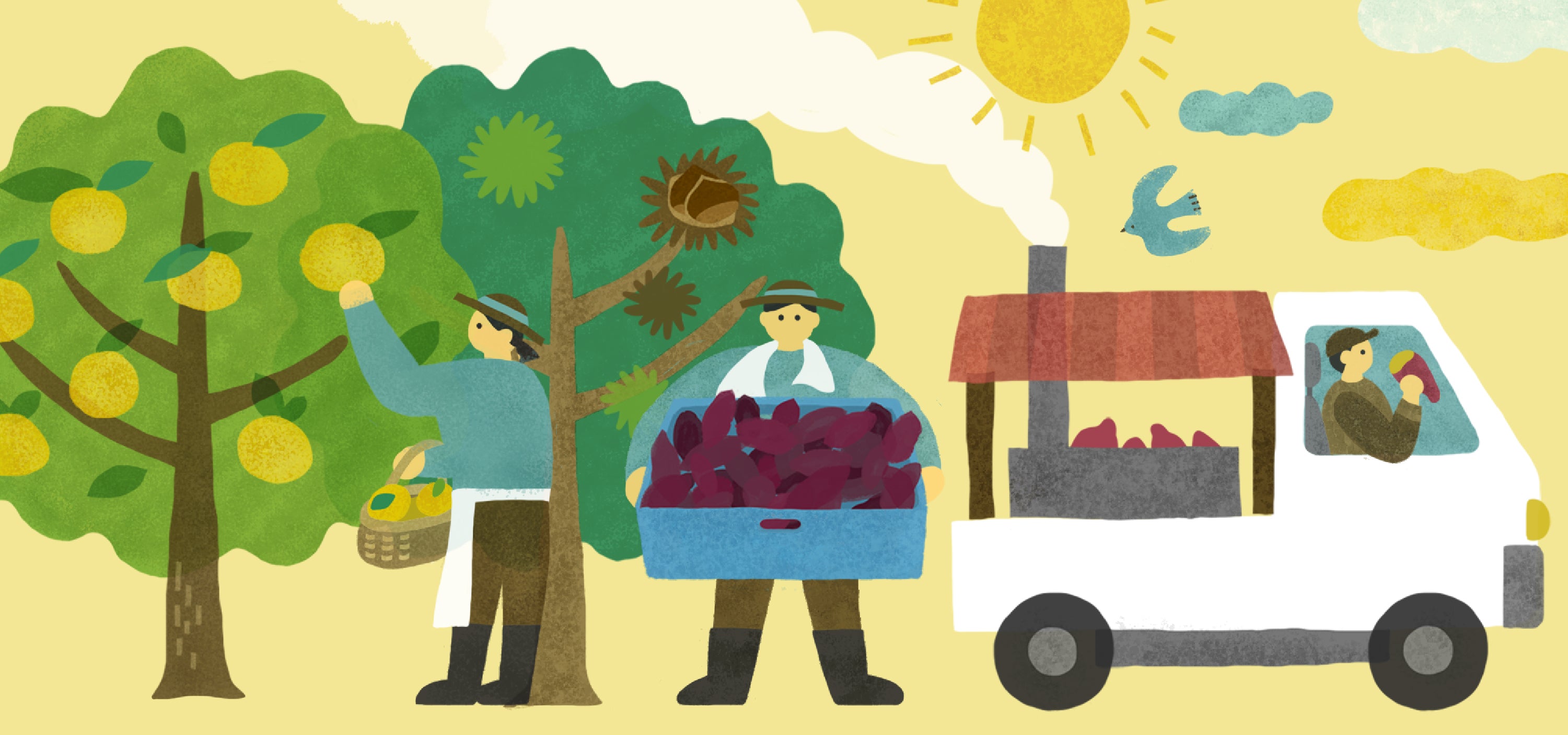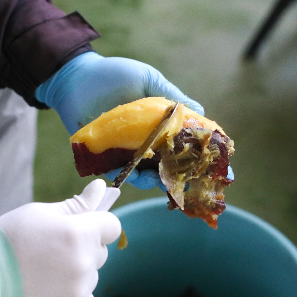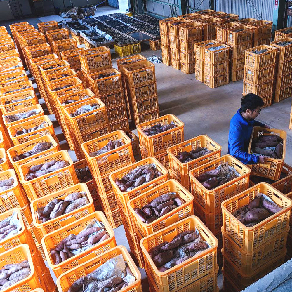 ゆずとくりは収穫したらすぐに提携先に出荷します。さつまいもは秋に収穫したのち、最低でも2ヶ月は貯蔵庫に保管して糖化を促し、甘みが増した状態で皆さまのもとにお届け。自社の加工場では、完全天日干しでつくる「干しいも」、蒸したさつまいもをペースト状にした「お芋ペースト」、「石焼き芋」や「冷凍焼き芋」などを丁寧に手作りしています。