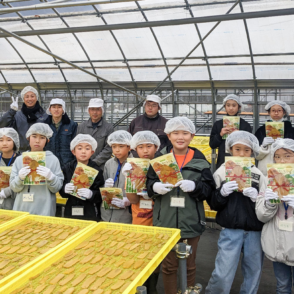 子どもたちには、「自分で育てたものを食べること」の大切さを知ってほしい。そんな思いから始めたのが、農業体験を通じた食育活動です。川根の小・中・高校生たちにさつまいもの苗を寄付し、一緒に苗を植え、秋になったら子どもたちの手で収穫してもらいます。採ったさつまいもは焼き芋にしたり、干し芋に加工したり。美味しく食べるところまでお手伝いしています。